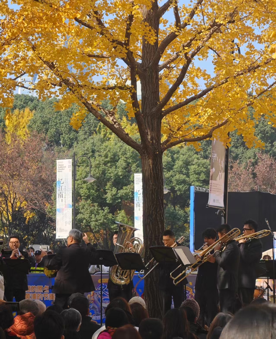 暖阳透过金黄的银杏枝叶,在地面铺就一层“金色地毯”,这片被市民称作“最美城市舞台”的户外空间,当天迎来了特殊的“铜管盛宴”。与往年的弦乐四重奏、国风民乐不同,2025年的音乐会由韩小明创立的上海铜管重奏团担纲演出——这位曾执掌德国广播爱乐乐团圆号首席的艺术家,集结了沪杭等地知名乐团的11位音乐家,从意大利小号演奏家斯特凡诺·弗拉伊巴尼到上海交响乐团的长号手,用顶尖阵容诠释铜管魅力。