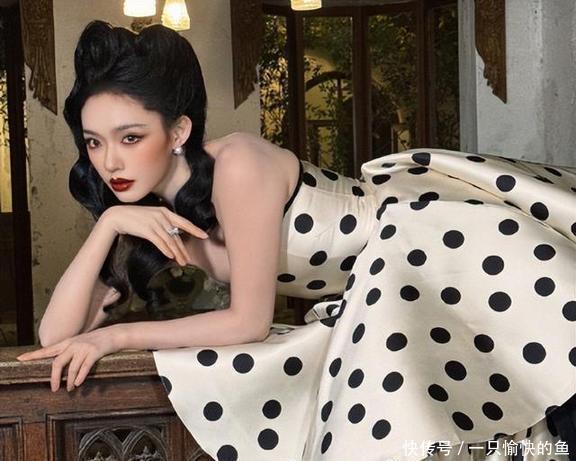 复古对称的盘发,再搭配米白色底的黑色波点缎面礼服。