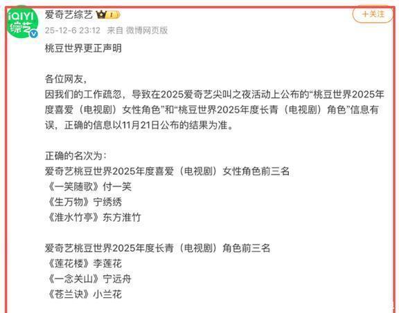 因为工作不细心,导致2025爱奇艺尖叫之夜活动上公布的“桃豆世界2025年度喜爱(电视剧)女性角色”和“桃豆世界2025年度长青(电视剧)角色”信息出现错误,准确的内容请以11月21日公布的结果为准。对此事造成的影响我们表示诚恳的歉意,以后我们会更加认真细致地去做。