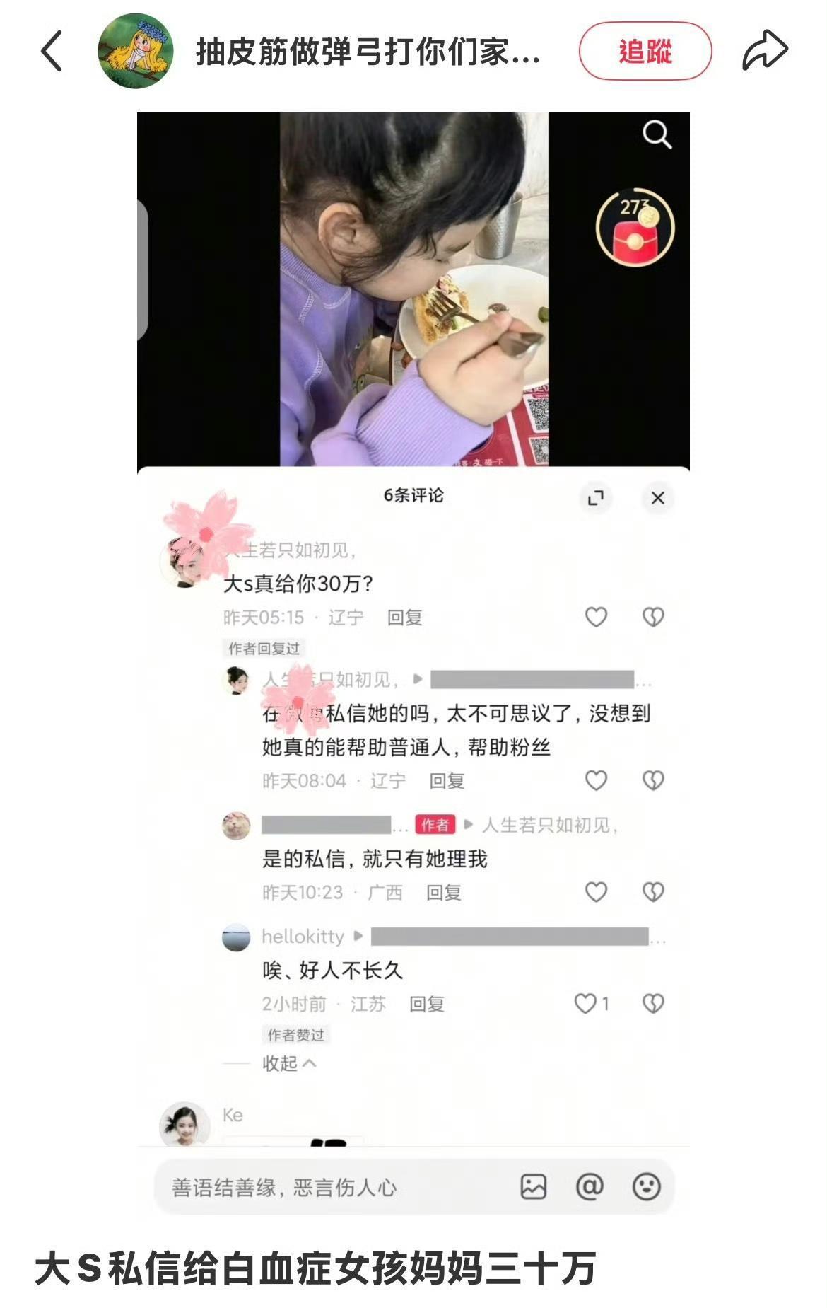 离世近十个月的大 S,11 月 26 号突然又冲上热搜!这次跟小 S 蹭流量、具俊晔或前夫汪小菲都没关系,竟是位普通网友晒出的往事。 这位网友说,前几年女儿得白血病,家里凑不出治疗费,抱着死马当活马医的心态给圈里明星发求助私信,发了一大堆全没下文,就大 S 回了!不仅耐心问清情况和费用,直接让她发卡号打了 30 万,还说这钱不用还,正是这笔钱救了孩子的命。大 S 被网暴最狠时她也替人说过话,可惜声音被骂声盖了,现在说出来就是不想让好人去世了还被抹黑。