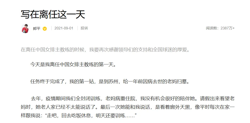 同年9月1日,中国女排主教练郎平在个人社交媒体宣布自己已经离任。