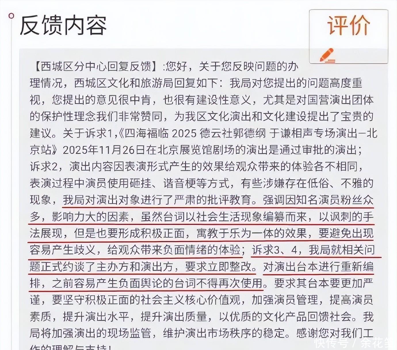 举报后第二天,官方就给予了反馈。官方针对举报者的四个诉求给予了反馈。第一个诉求回应,郭德纲、于谦在11月26日在北展的演出是通过审批的。也就是说,演出整体是合法、合规的。
