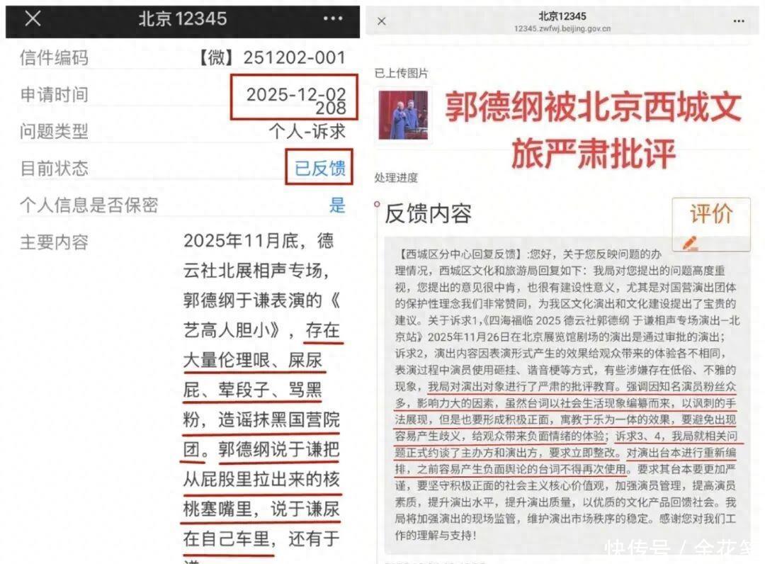 12月6日,郭德纲北展演出被举报,两张举报截图被晒出,在网友之间引起热议。