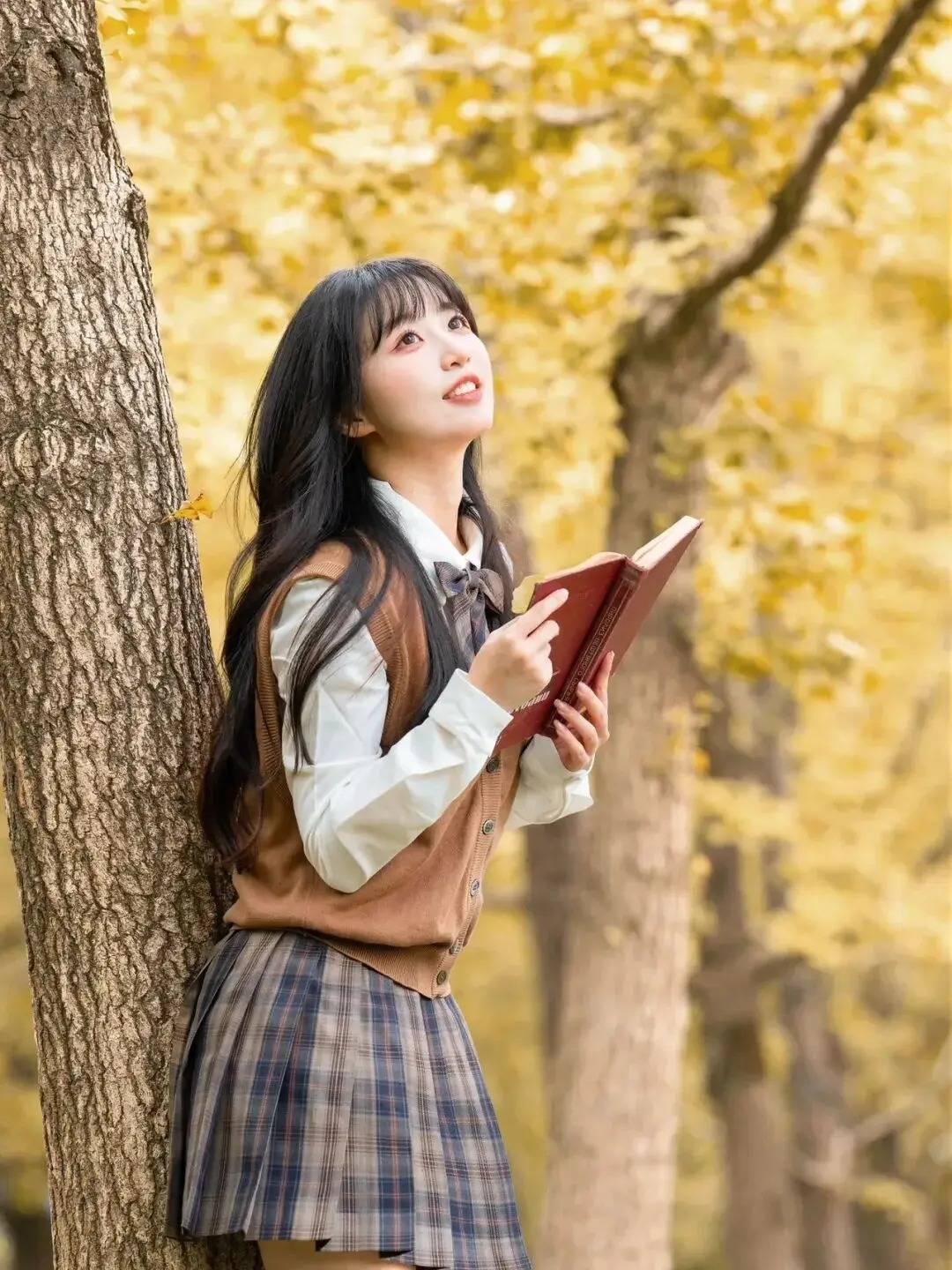 人物以树干为依托,姿态松弛又有故事感,一手捧书、一手轻扶书页,仰头的动作让画面充满灵动。在金黄秋林的衬托下,这种“倚树读拍”把文艺与秋日浪漫融合得恰到好处,仿佛正与落叶共赴一场诗意之约。学会这招,你也能在林间拍出满是治愈感的清新大片~