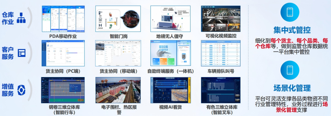 平台支持货主、物流公司、银行等多方协同,提供PC端、移动端、自助终端一体化服务,可针对钢卷、有色等大宗商品实现三维立体库管理、电子围栏、热区报警、视频AI看货等场景化管控,做到数据统一、监管透明、服务高效。
