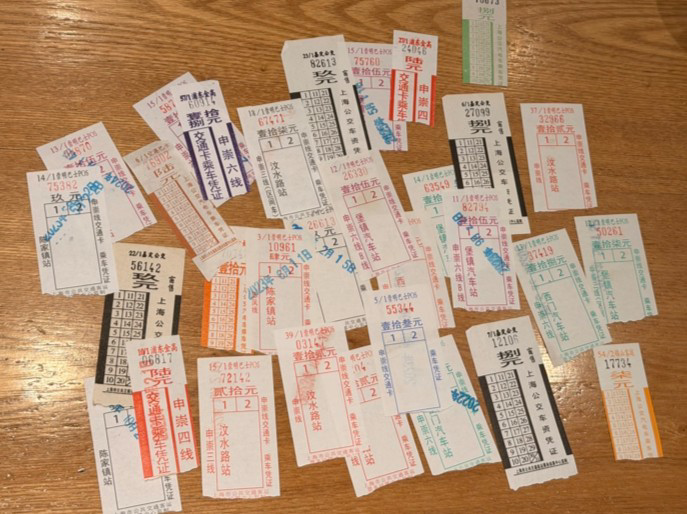 公交迷居逸杰会随身携带收藏的公交车票。(受访者供图)
