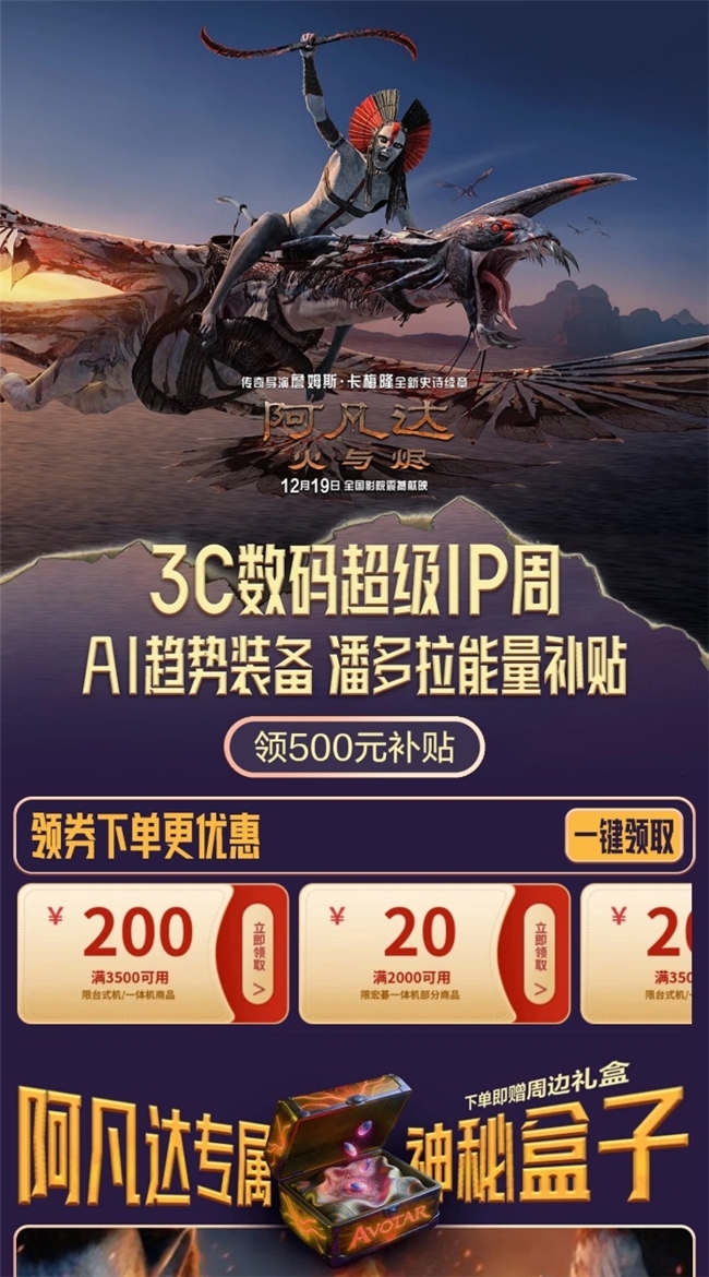 值得关注的是,京东还推出数码潮电专属福利,众多趋势尖货低至5折,消费者下单投影仪类等阿凡达专属盒子即可获赠电影周边,华为、小米、苹果等手机、笔记本、耳机等AI装备限时低价秒杀,让消费者以更划算的价格升级设备,重温《阿凡达》系列的震撼视觉效果。