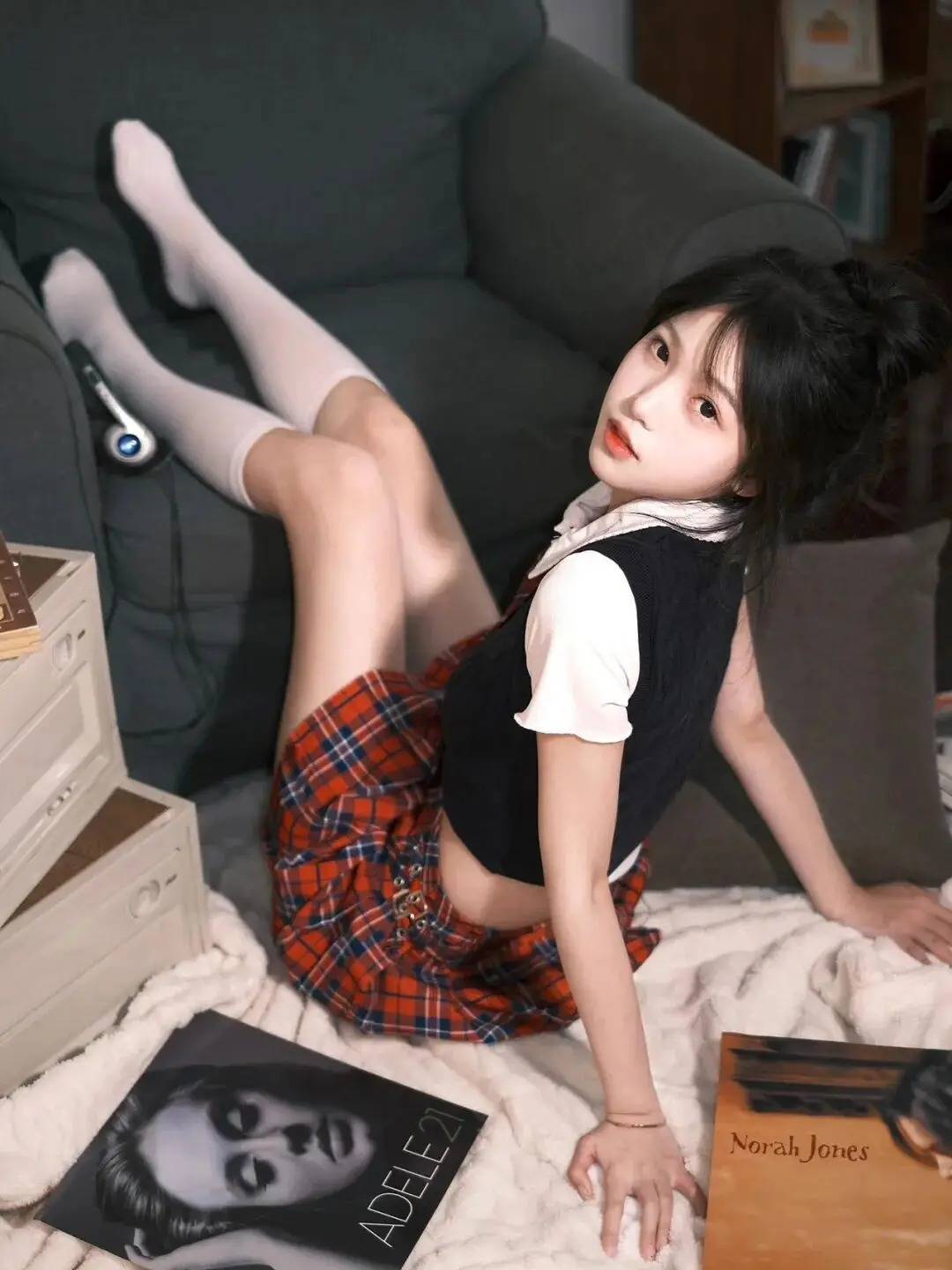 人物用“手肘支撑+指尖托腮”的姿势,瞬间打造出娇俏又带点小思考的神态。半倚在沙发上,肢体线条随性又有层次,校园风穿搭和背景的复古小物件一搭,氛围感直接拉满。这种看似不经意的pose,把少女的灵动与娇憨拿捏得死死的,谁看了不心动~