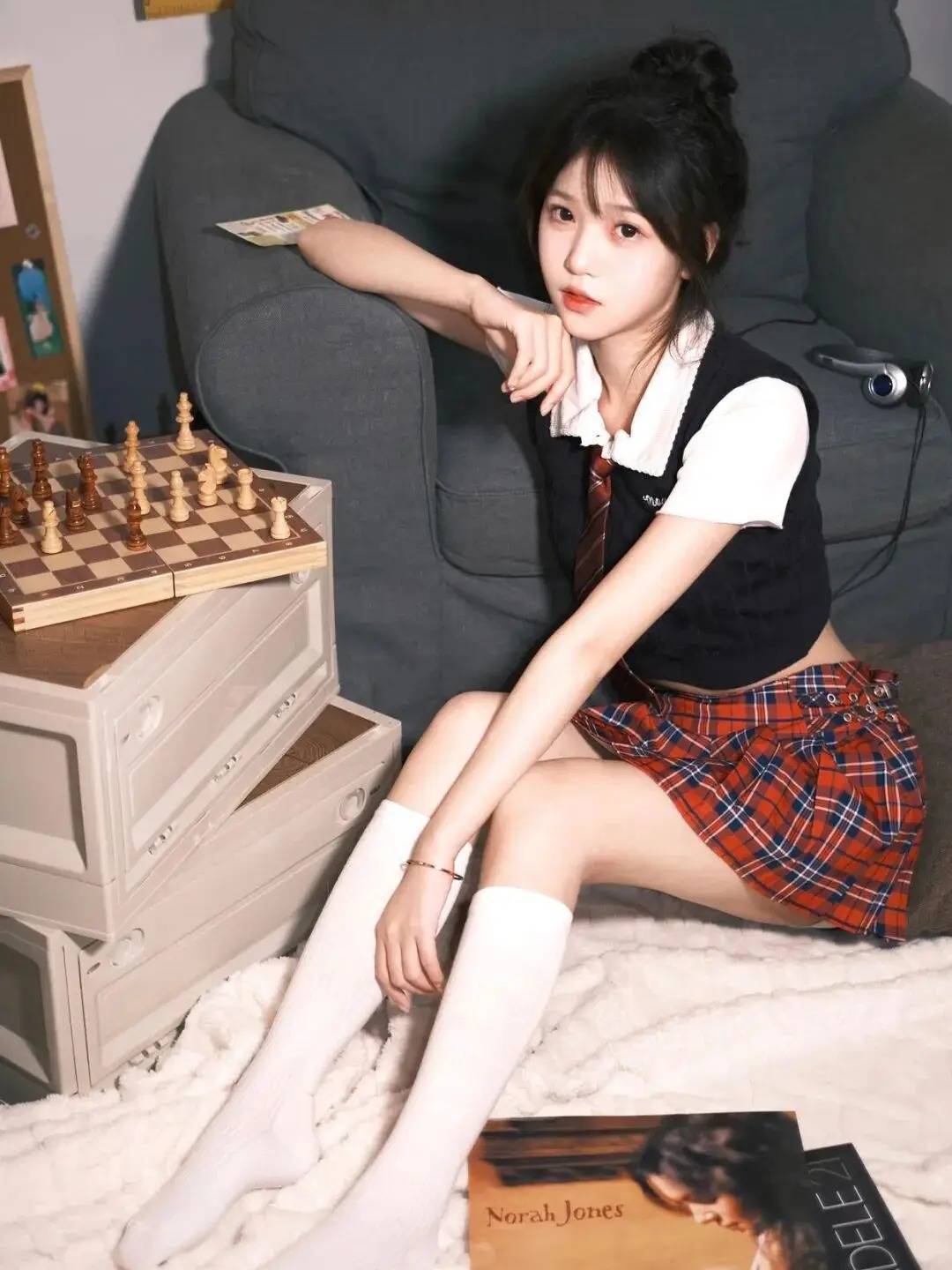 人物采用“斜倚+肢体延伸”的姿势,一只手臂搭在沙发上营造松弛感,另一只自然垂下拉长线条。校园风穿搭配上毛绒地毯的温柔,再借棋盘和复古物件打造场景故事感,这般姿势把甜酷少女的慵懒与精致平衡得恰到好处,谁看了不想跟着get同款出片思路~