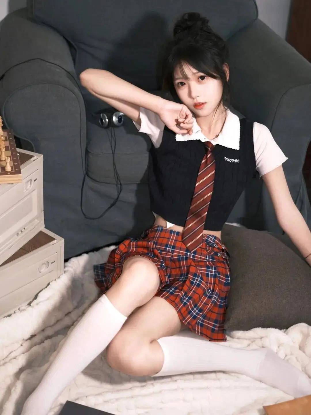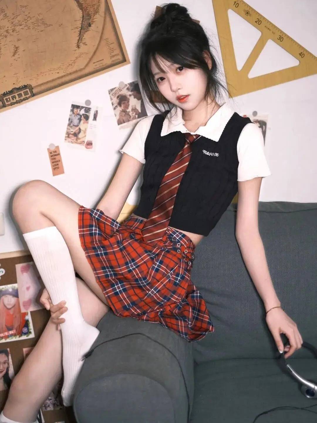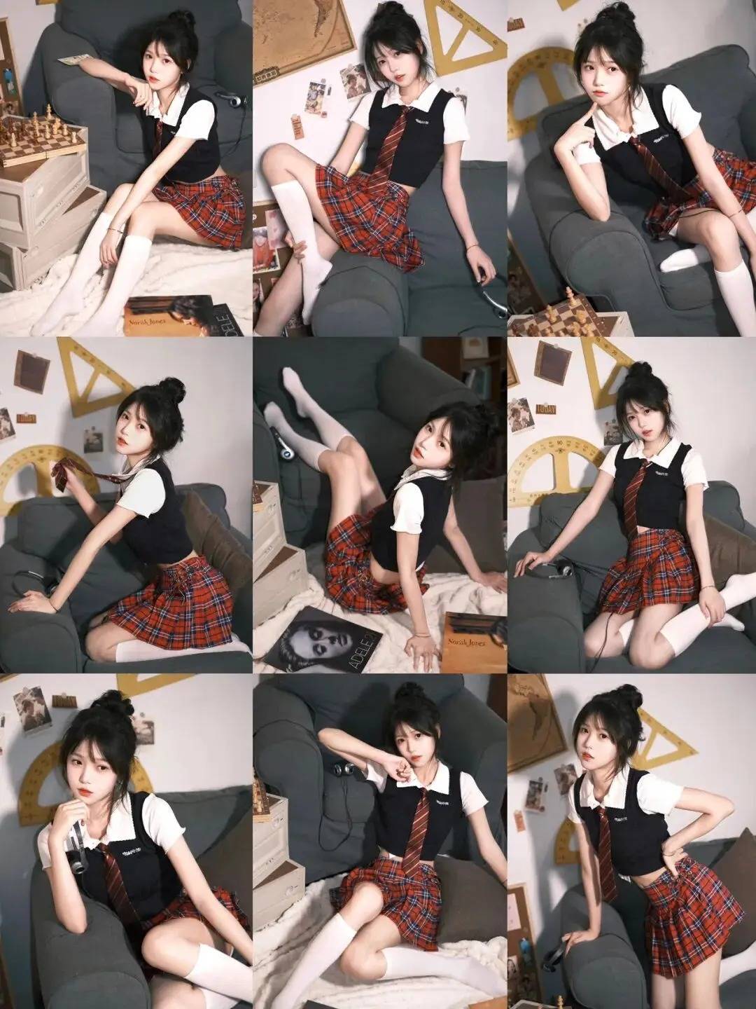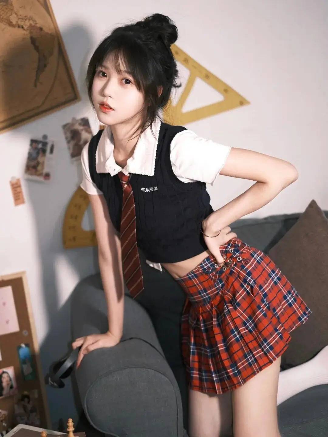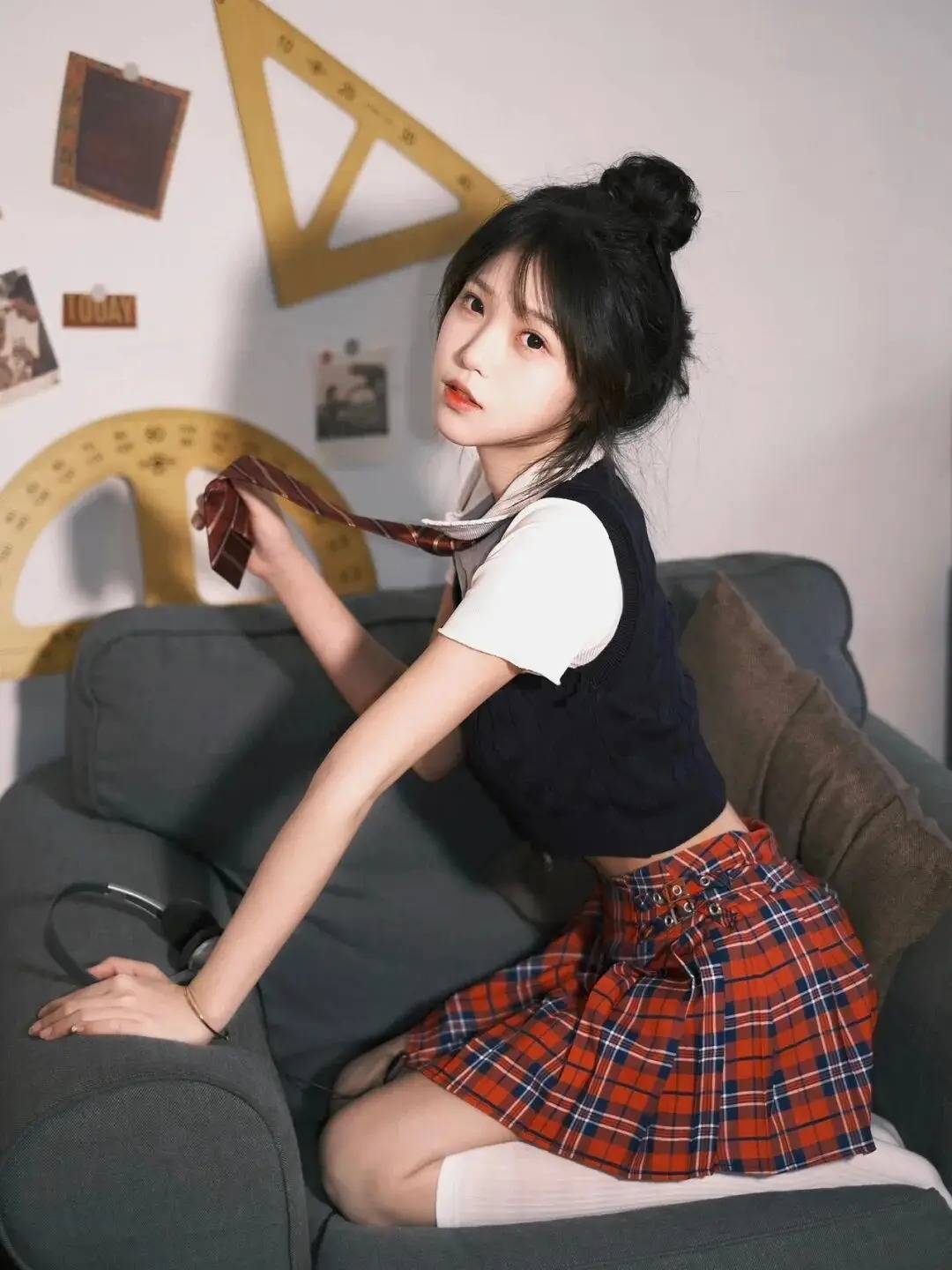 人物采用“半跪姿+侧身回眸”的组合,既展现灵动又藏着小性感。一手轻扯领带制造动态感,另一手撑在沙发上形成线条呼应,丸子头的俏皮与校园风穿搭适配度拉满,背景的复古教具还增添了场景故事感,这般姿势把甜酷学姐的氛围感拿捏得恰到好处~