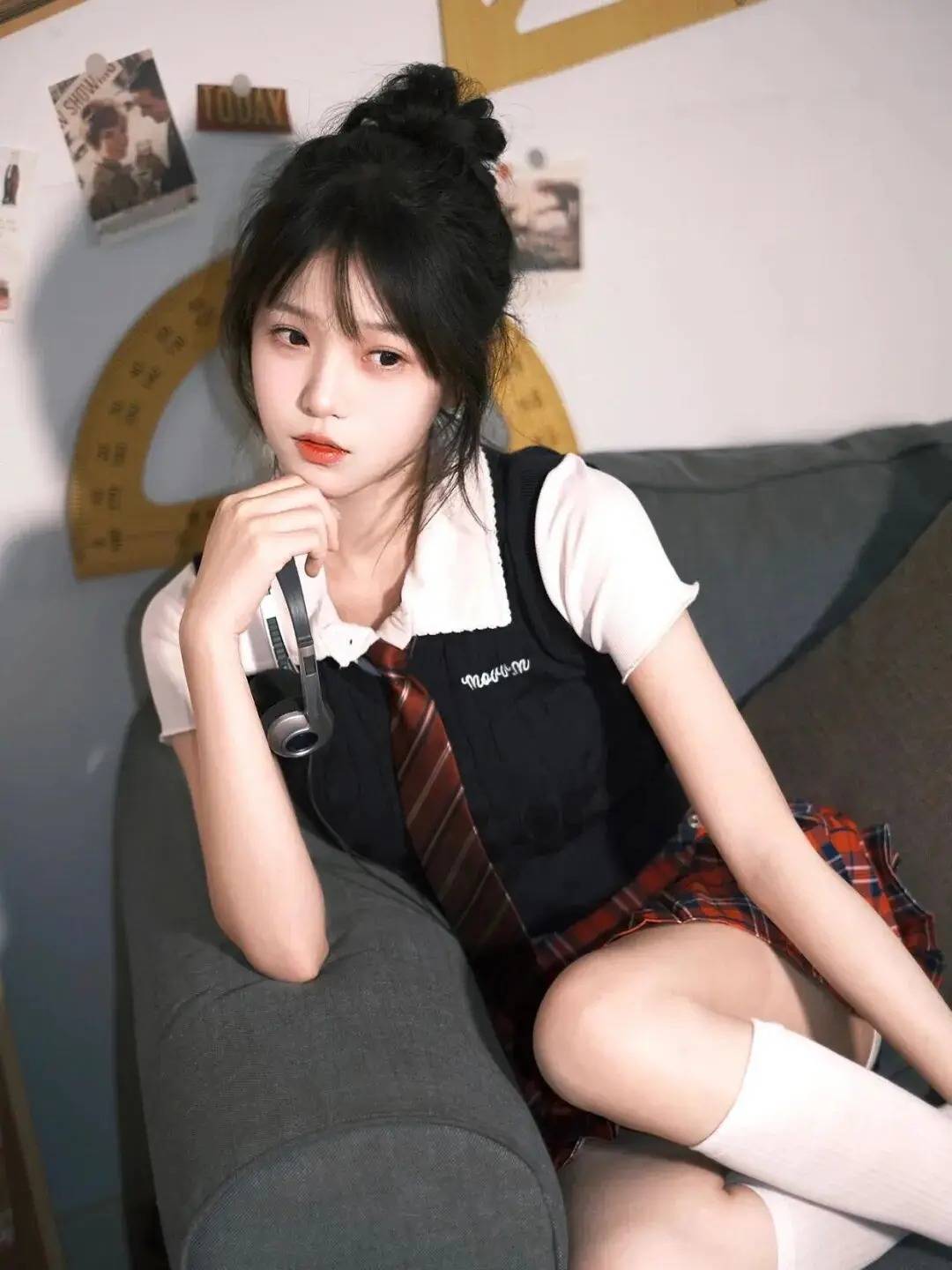 人物以“跪坐沙发+肢体错落”的姿势,一手轻握耳机增加互动感,另一手搭在腿间形成层次。丸子头搭配校园风穿搭,甜酷感直接拉满,背景的复古教具还衬出了独特氛围。这种姿势把少女的灵动与娇俏融合得恰到好处,谁拍谁是校园风大片主角~