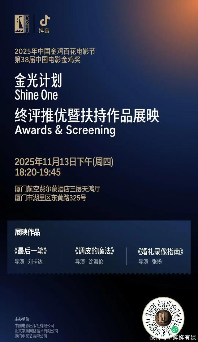 2025年5月,首届“金光计划”在戛纳电影市场活动中正式官宣启动,“金光计划”旨在挖掘兼具艺术价值与时代精神的优质影像作品,为中国电影产业注入创新动能。“金光计划”特别邀请黄晓明、周冬雨、肖央三位知名影人担任发起人。正式官宣征片启动后,影响力遍及圈内外。2025首届金鸡“金光计划”最终揭晓三项推优荣誉:其中刘卡达导演的《最后一笔》获全场压轴大奖,荣誉推优短片作品。《最后一笔》讲述护工林慧破解生命晚期张叔留下的字符,并揭开隐藏真相的故事。影片由钱漪(代表作:繁花,扫毒风暴,不眠日,向阳花),周楚濋(代表作:误杀2、3,唐人街探案2,最好的我们,风犬少年的天空)两位实力派演员主演。