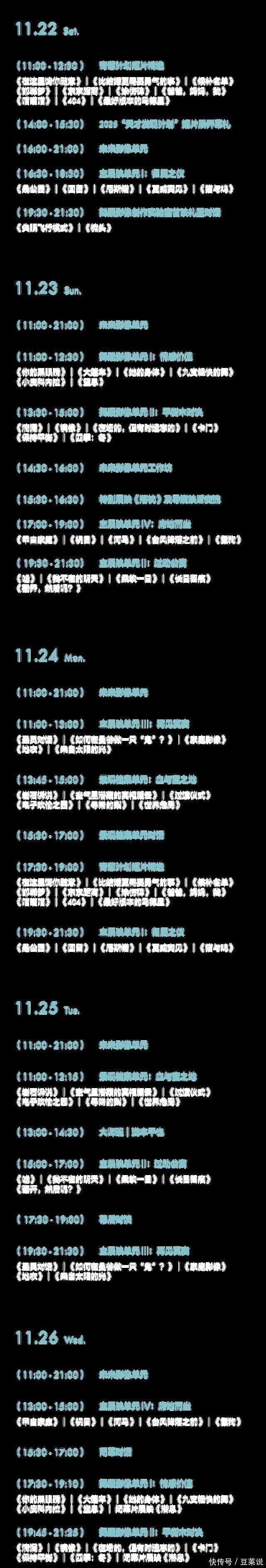 《保持平衡》 伯纳德·威格尔 丹妮丝是一位20岁的女孩,她几乎每天都会去维也纳的普拉特游乐园,反复乘坐电子塔加达旋转盘,这样可以帮助她走出过去的阴影。《保持平衡》是一部关于在人生中寻找平衡的故事。无论经历什么,总有办法度过艰难时光。 导演赵丹执导、易烊千玺主演、凃力元编舞的短片《潜息》将于11月26日放映。作品以舞蹈影像的形式呈现人、身体与自然之间的流动关系。短片中,易烊千玺置身山林深处,在低伏的嗡鸣声中前行。群舞者以身体构成山、水、兽、林等自然形态,在运动中展现自然的生成、抗衡与拥抱。主角的身体在推拒与吸纳之间不断发生变化,既是探索者,也是被自然重塑的存在。